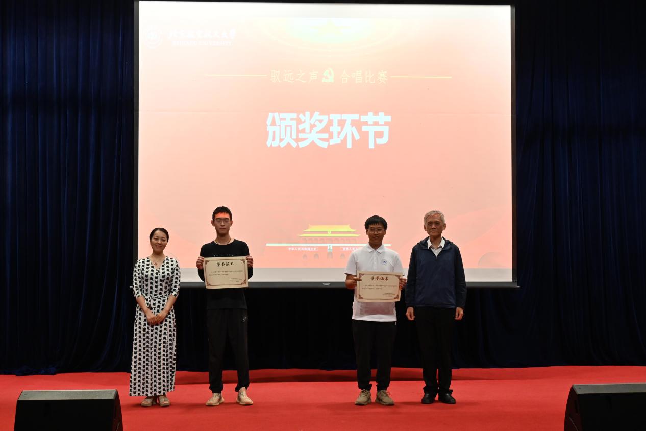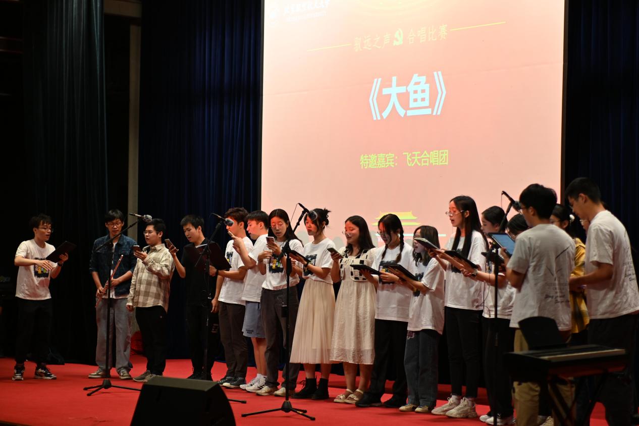 参赛班级进行演唱赛程告一段落后,公司飞天合唱团作为此次比赛的特邀嘉宾,为大家带来了合唱《大鱼》和笛子独奏《红蜻蜓》。这不仅仅是音乐的展演,更是一场跨越时空的情感交流,所有观众为之沉醉与感动。在登台的合唱团成员中,多数都担任了本次比赛的指导老师,负责班级曲目的指导和编排。他们用自己的热爱和努力帮助每一个班级“从零起步”,让更多同学了解合唱,爱上合唱。