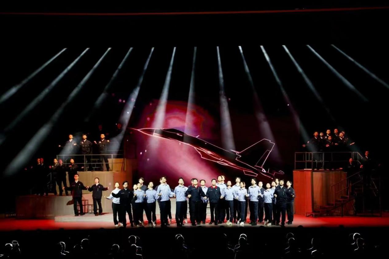 演出现场座无虚席,在场师生、员工聚精会神观看表演,从剧中汲取精神力量。演出结束后,观众纷纷表示“感受到了新中国航空工业的飞速发展,也体会到了‘国之重器,以命铸之’的责任与担当。”感慨英雄远行十年,罗阳精神永驻。