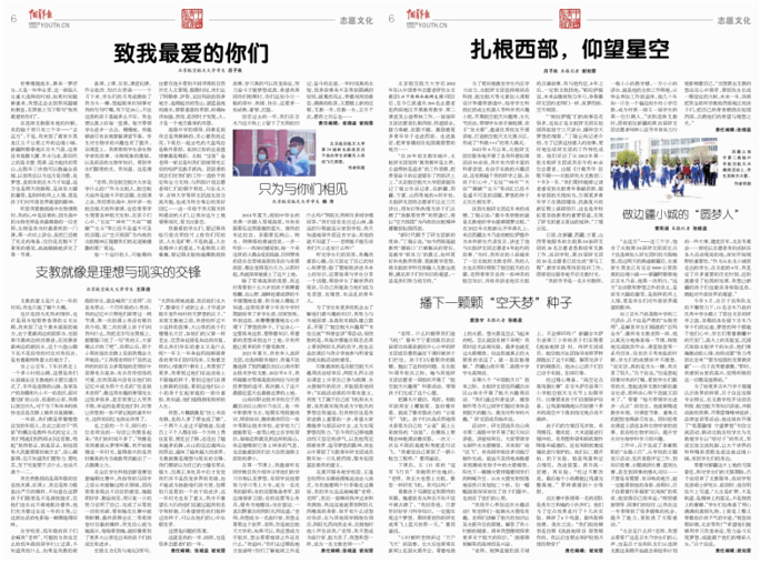 2023年7月18日,由共青团中央主管、中国青年报社主办的《中国青年作家报》志愿文化整版报道w88win体育官网入口研究生支教团事迹。作为其中的一员,吕子良参与中宣部志愿服务促进中心、中国青年志愿者媒体中心线上文化宣传志愿,运营“中国志愿”“西部志愿汇”公众号,编辑推送200余篇,阅读量超过400000人次。