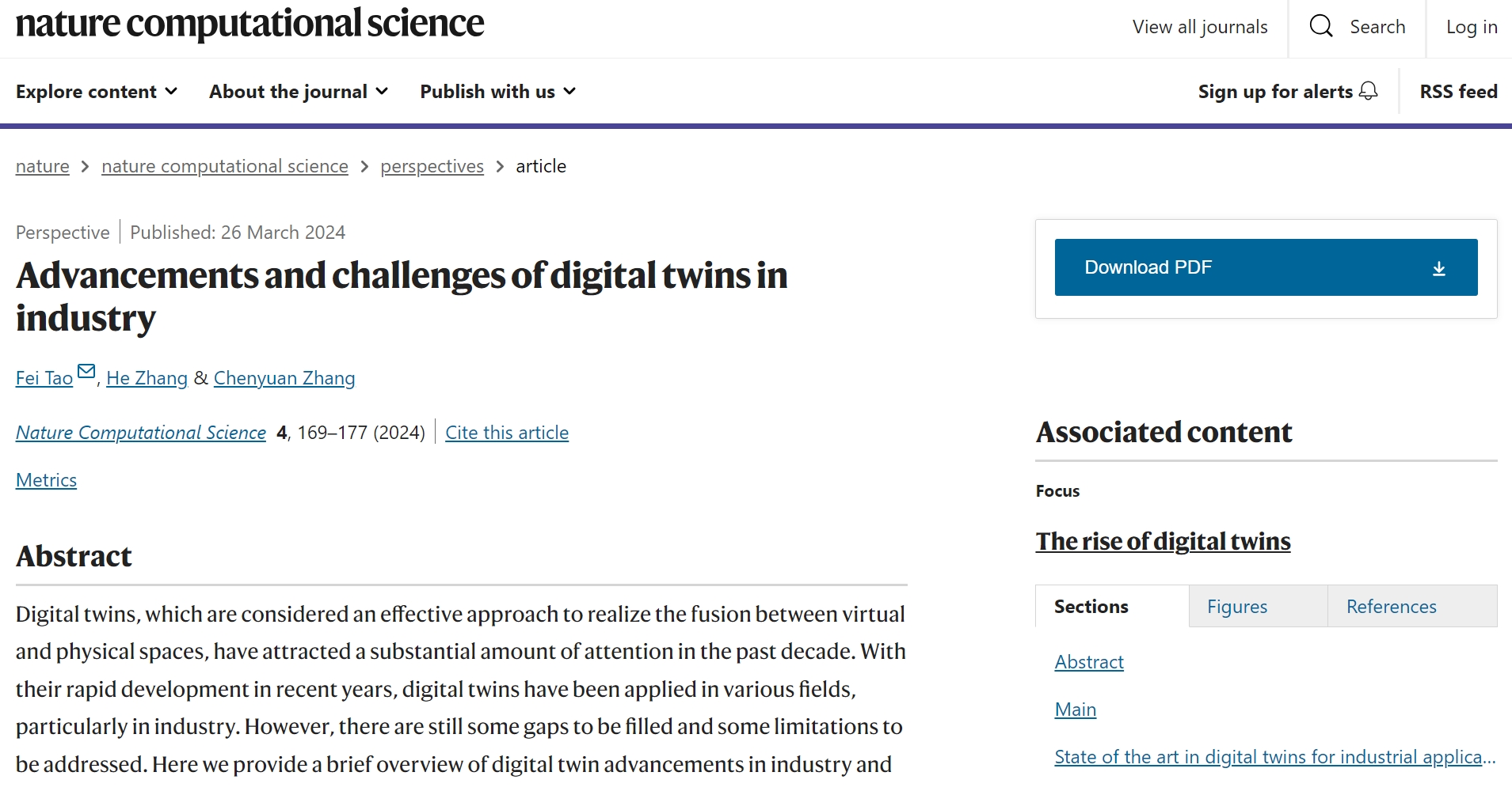3月27日,陶飞教授团队受邀在《Nature Computational Science》杂志发表了工业领域数字孪生的综述与最新视角长文文章:《Advancements and challenges of digital twins in industry》。该文章对国内外数字孪生在工业领域的最新研究与应用进展进行了总结,深度剖析了数字孪生理论研究与工业实践过程中存在的问题及面临的挑战,并指明了未来发展方向。陶飞教授、张贺博士后、博士生张辰源为该文作者,陶飞教授为通讯作者,w88win体育官网入口为第一单位。