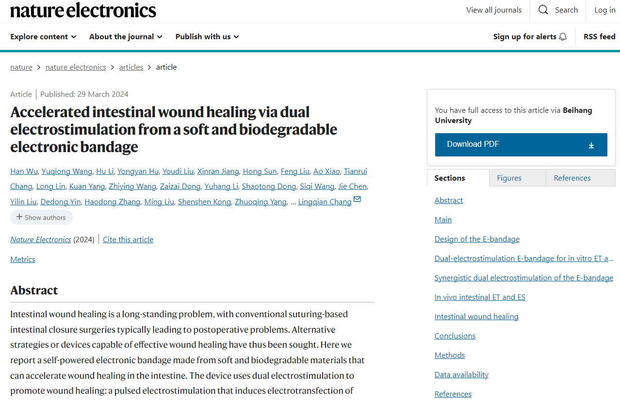 3月29日,常凌乾教授团队报道了一种柔性、可生物降解、自供电电子绷带,能够提供双模式电刺激,协同加速和改善肠道伤口愈合,并显著减少了术后并发症。相关成果以“Accelerated intestinal wound healing via dual electrostimulation from a soft and biodegradable electronic bandage”为题,发表在《Nature Electronics》上。北航生物与医学工程公司博士生吴晗、王玉琼博士、李虎博士等为第一作者,北航常凌乾教授、王柳助理教授,宾夕法尼亚州立大学余存江教授为通讯作者,w88win体育官网入口为第一单位。